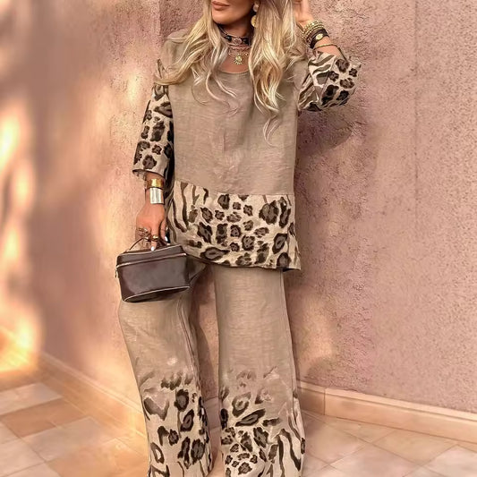 Ines Fede™ Dámský volnočasový komplet s kulatým výstřihem a leopardím vzorem