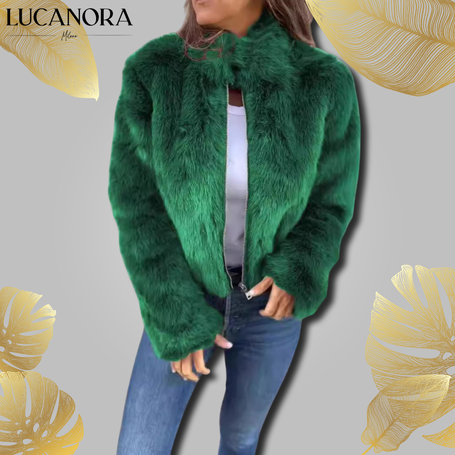 Ultra měkký plyšový materiál této bundy vám dodá pocit, jako byste byli zabaleni do deky, a zároveň vypadáte elegantně. Díky vysokému stojatému límci a měkkému lemování z umělé kožešiny je pohodlná a zároveň výrazná. Má zip vpředu pro snadné oblékání a svlékání a uvolněný střih vám poskytne pohodlí při pohybu, aniž byste musela slevit ze stylu.