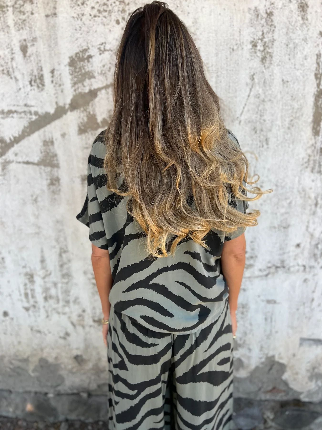 Kalhoty se zebřím potiskem jsou hvězdou přehlídky a jejich široká silueta vám dodá bez námahy pohodový, uvolněný pocit. Tento komplet je vyroben z měkké a prodyšné tkaniny, takže se v něm budete cítit stejně dobře jako vypadat po celý den.