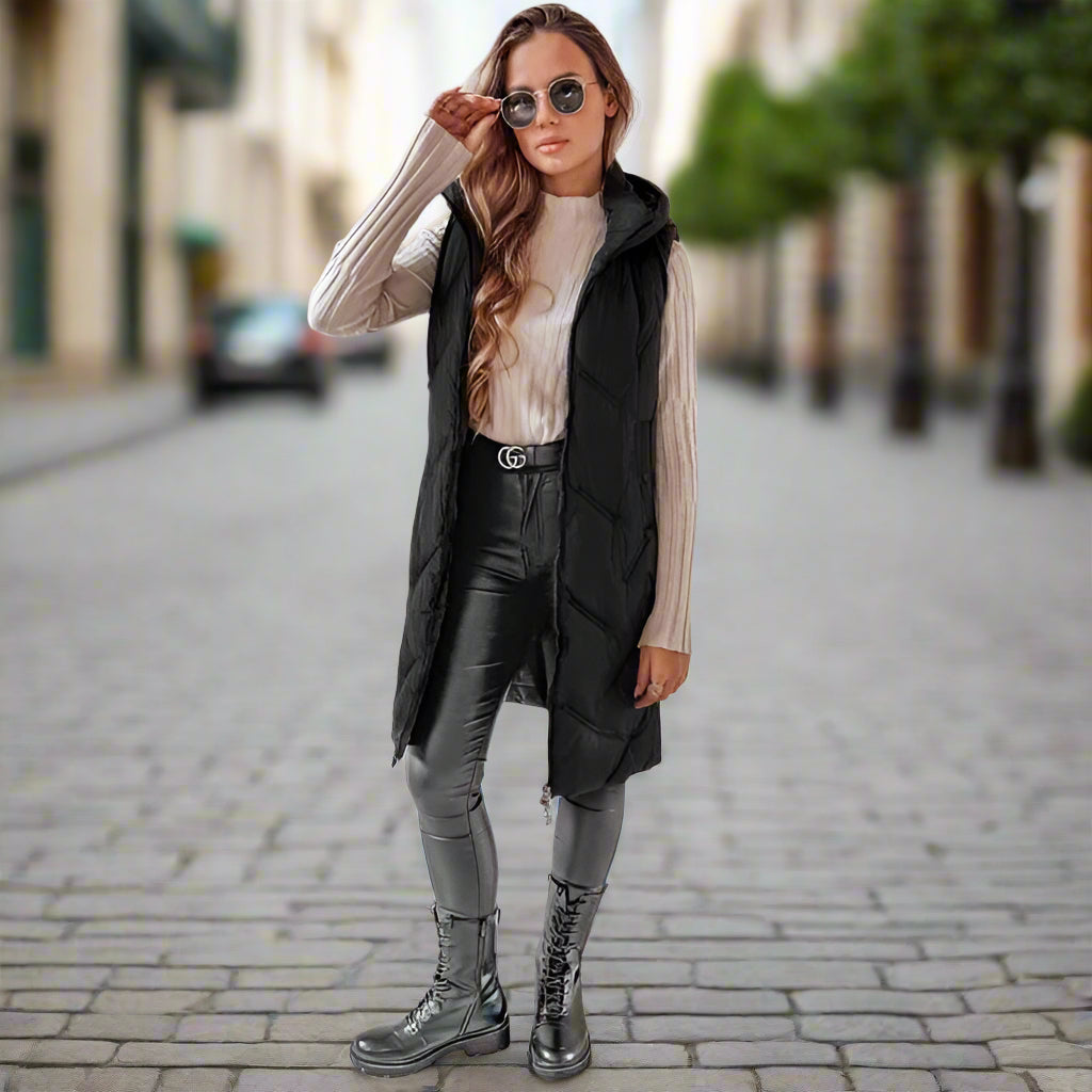 Tato vesta je vaším novým nejlepším přítelem pro chladné dny. Tento trendy, lehký kousek vám dodá bez námahy cool vrstvený vzhled a zároveň vás udrží v teple a pohodlí. Její dlouhý, prošívaný design lichotí vaší siluetě a připojená kapuce dodává nádech ležérního šarmu – ideální pro ranní procházky, víkendové kávové výlety nebo procházky městem, když teploty klesnou.