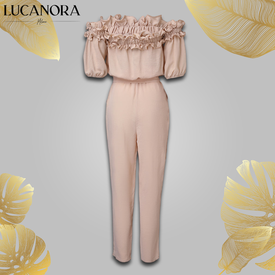 Tento kombinéza s volánkovým lemem je přesně to, co potřebujete – design s odhalenými rameny odhaluje váš elegantní výstřih a dekolt, zatímco volánkový lem dodává nádech jemné, hravé ženskosti, která okamžitě přitahuje pozornost