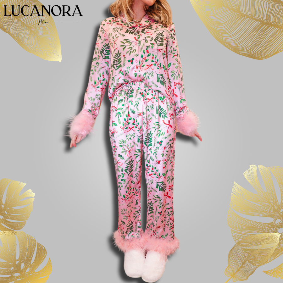 Tyto růžové vánoční pyžama vás zahalí do svátečního kouzla od hlavy až k patě. Představte si to: hedvábně růžový základ posetý zelenými a červenými stužkami, doplněný manžetami s péřovými lemováním na rukávech a kalhotách, které dodávají extra nádech fantazie.