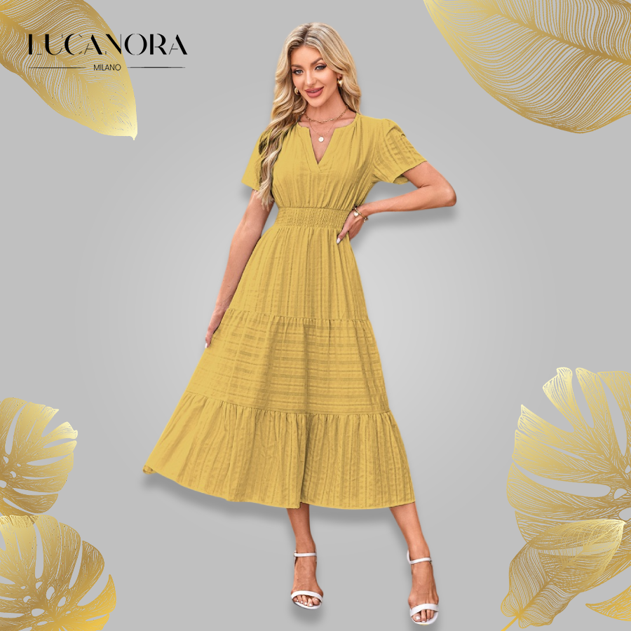 Tyto šaty s lichotivým výstřihem do V a splývavou siluetou zvýší váš přirozený půvab a zároveň vám zajistí pohodlí po celý den. Ať už se chystáte na formální událost, nebo si užíváte neformální výlet, tyto šaty se bez problémů přizpůsobí každé příležitosti.