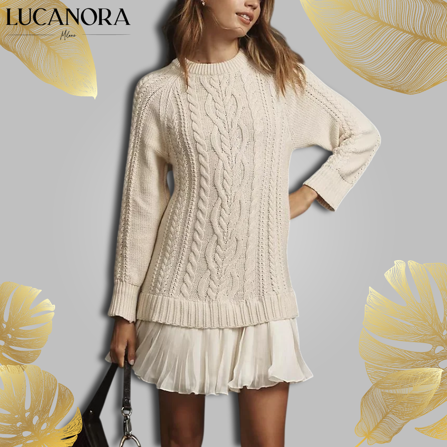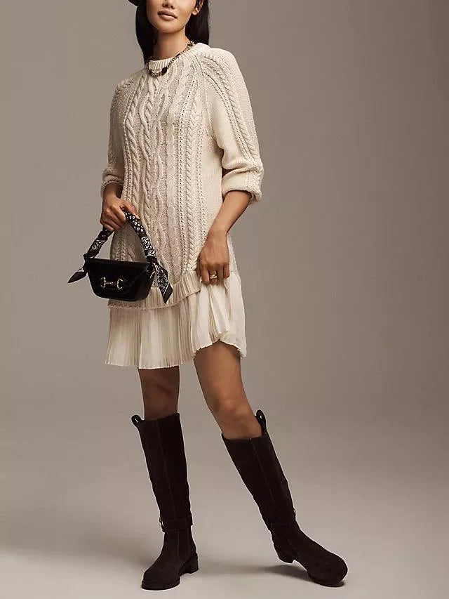 Představte si měkký pletený svršek, lichotivý pas a vzdušnou sukni ve tvaru písmene A, která se krásně vlní. Má volný svršek, který není příliš těsný, ale přesto perfektně obepíná pas a boky. Ideální pro chladnější dny, kdy se chcete cítit v teple, aniž byste se cítili neforemně.