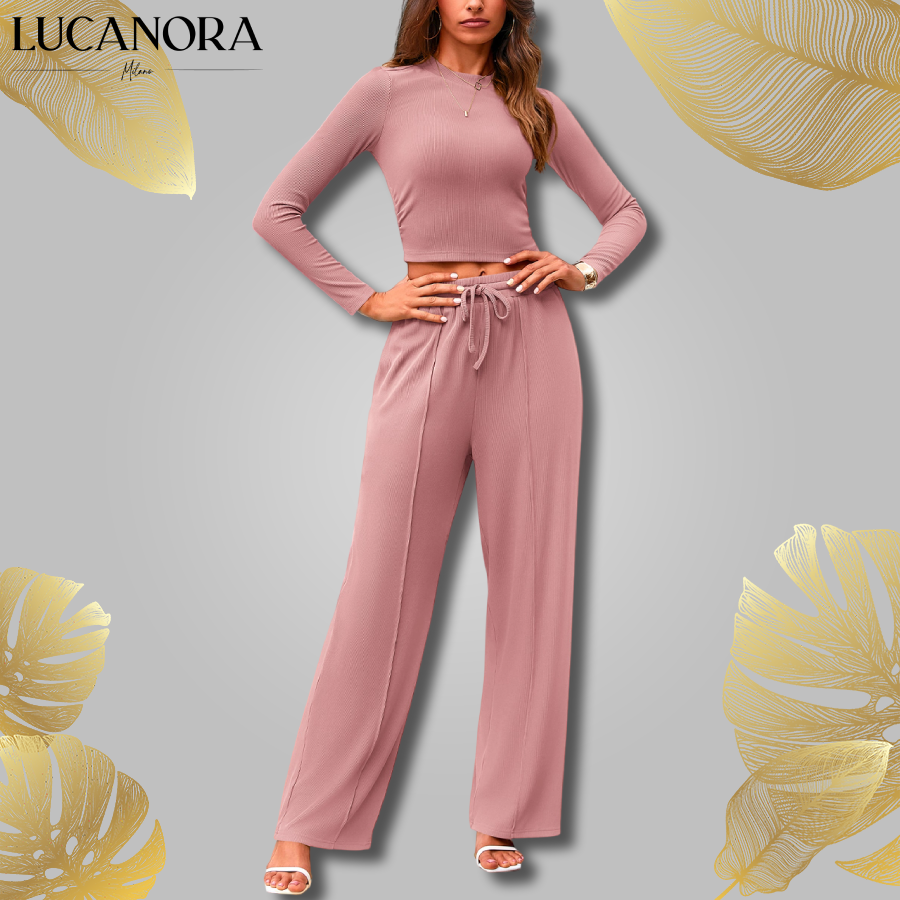 Tento snový komplet se skládá z krátkého topu s dlouhými rukávy a širokých kalhot, které se perfektně přizpůsobí vaší postavě a vlají, jako byste se vznášela. Díky žebrované textuře, která vám dodá příjemný pocit a elegantní vzhled, se v něm budete nejen cítit dobře, ale také vypadat dobře.