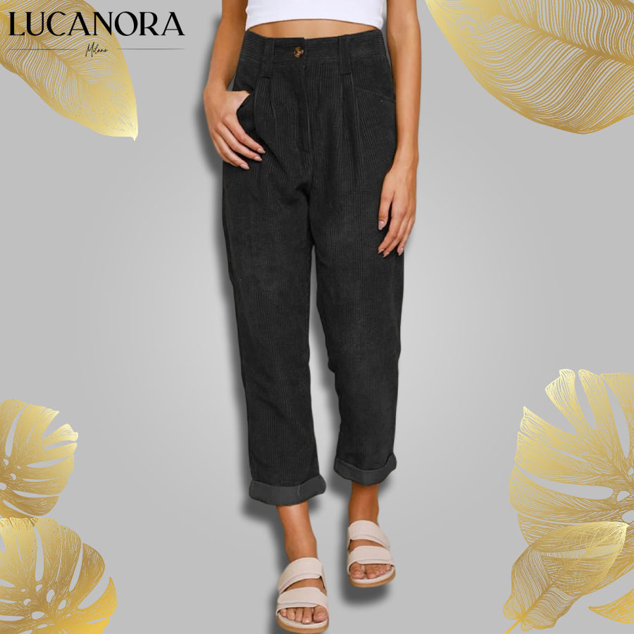 Vyrobené z prémiového manšestru, kalhoty nabízejí dokonalou rovnováhu mezi jemností, strukturou a nadčasovým vzhledem. Středně vysoký pas zajišťuje pohodlné nošení po celý den, zatímco zip a dekorativní knoflíky dodávají jedinečný charakter. Noste je s ohrnutými lemy pro ležérní styl nebo s podpatky pro elegantnější vzhled tyto kalhoty se přizpůsobí každé příležitosti.