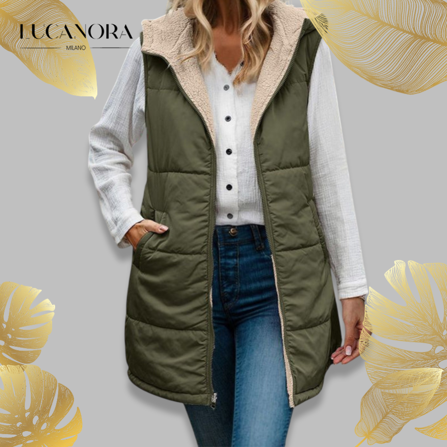 Naše bunda má oboustranný design, který vám nabízí možnost flexibilně přepínat mezi dvěma šikovnými styly bez námahy. Ať už se chystáte na neformální denní vycházku, nebo na sofistikovaný večerní look, tato vesta se přizpůsobí vašim potřebám.