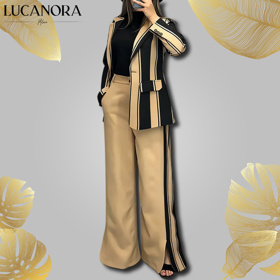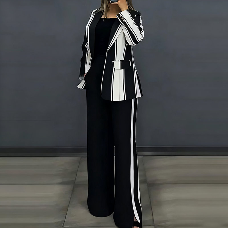 ✔ Trendový design: Tento set kombinuje elegantní sako s širokými kalhotami, které působí módně a nenuceně. Díky vertikálním pruhům a barevným blokům upoutáte pozornost bez jakékoli námahy.