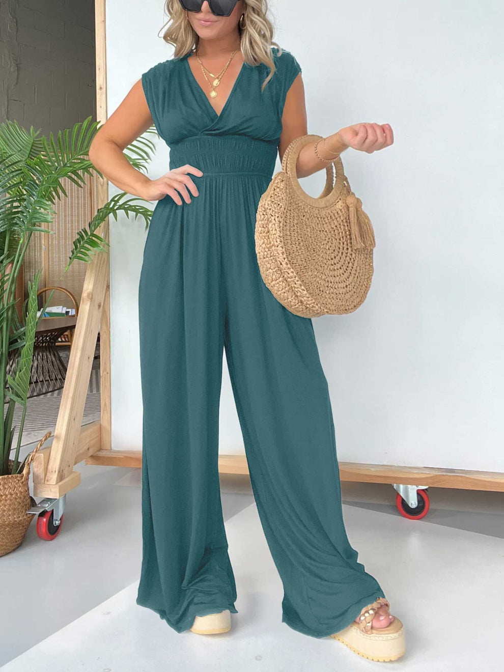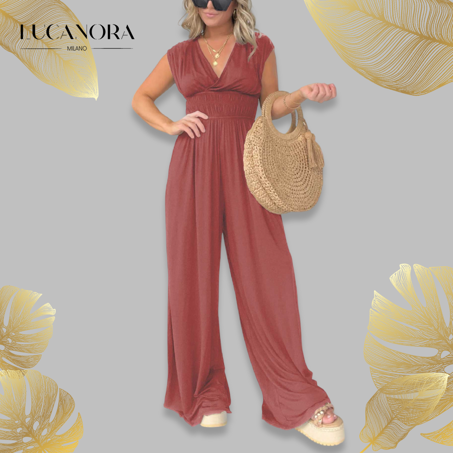 Je vyroben z měkké, prodyšné tkaniny, lehce se obtáhne přes vaše tělo a nabízí uvolněný střih, aniž by obětoval styl. Široký výstřih do V dodává eleganci. Ať už se chystáte na pozdní snídani nebo na neformální večer, tento overal je vhodnou volbou pro každou příležitost.