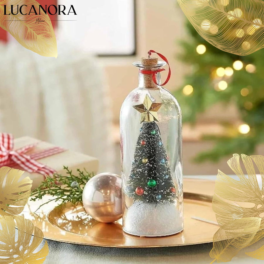 ✔ Kouzelný design – Skleněná lahvička s vánočním stromečkem, stuhou a korkovým uzávěrem.