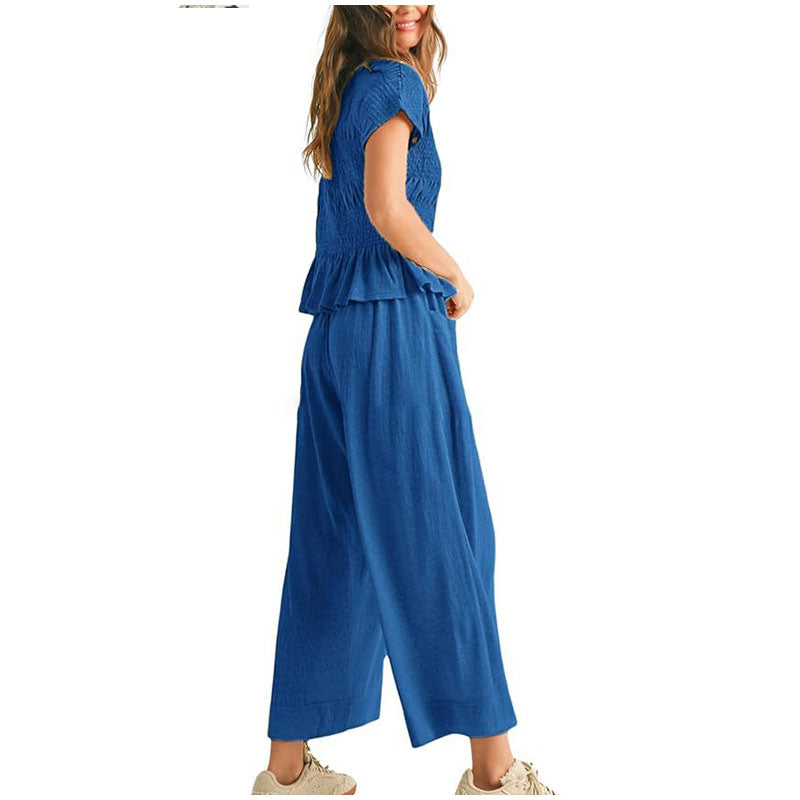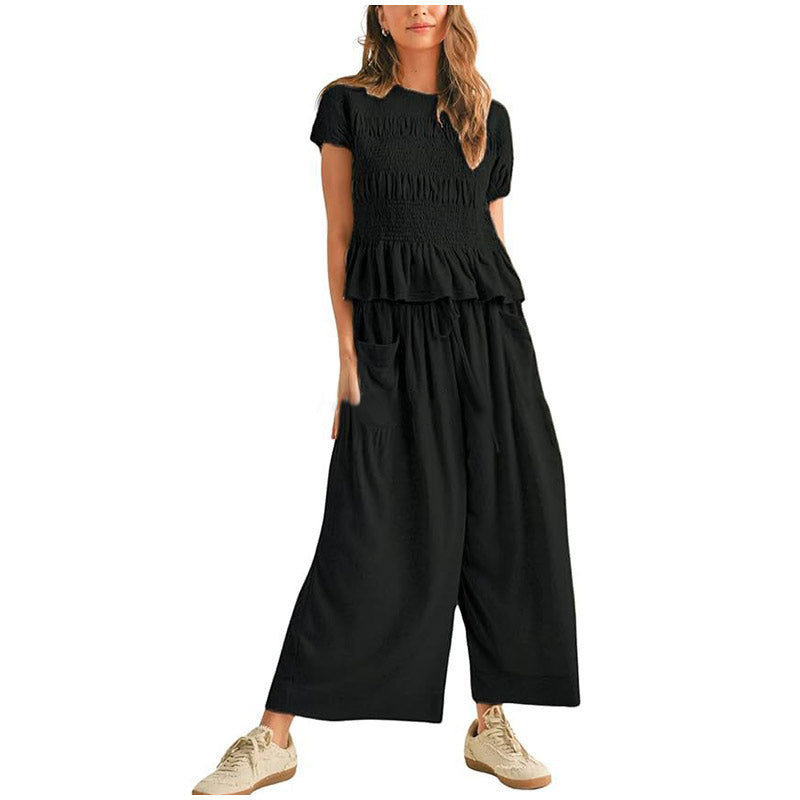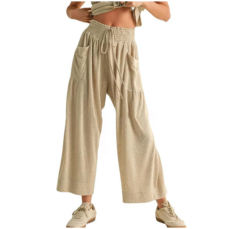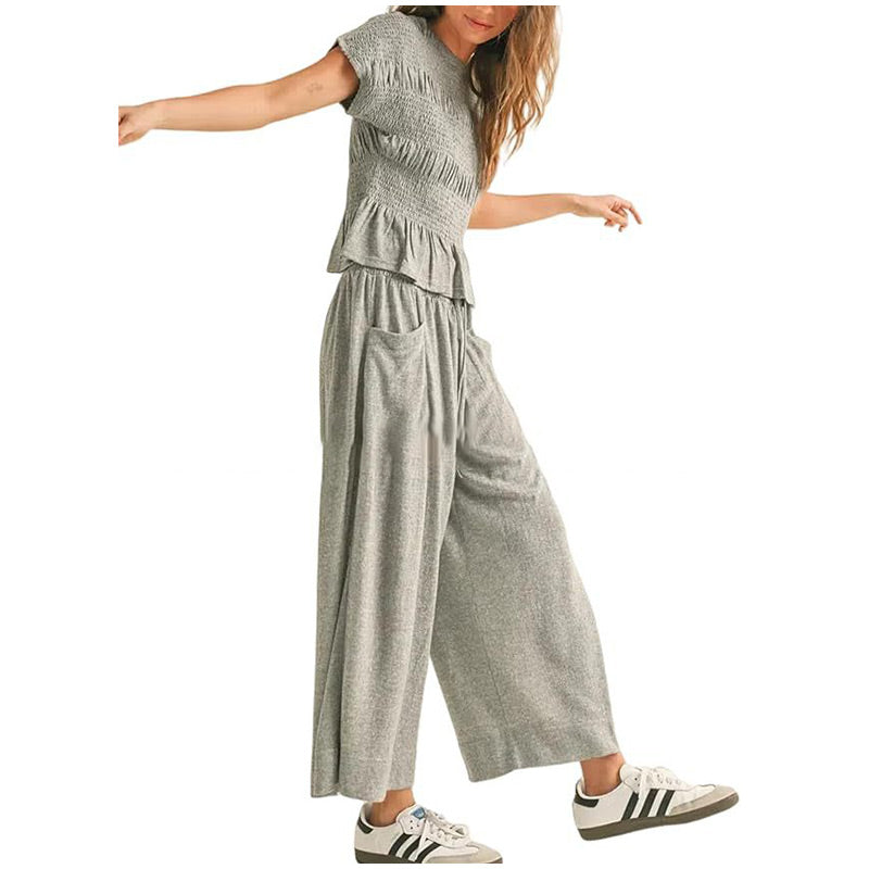 Tato elegantní kombinace topu a širokých kalhot je ideální volbou, pokud chcete vypadat upraveně bez zbytečné námahy. Top má jemné detaily, které obepínají správná místa a zároveň vám umožňují dýchat, a elastický pas kalhot vám poskytuje dostatek prostoru pro pohyb.