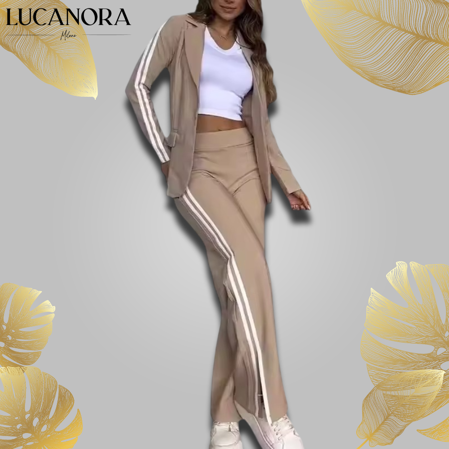 Tento volnější střih obsahuje vypasované sako a široké kalhoty, které lichotí každé postavě. Měkká, prodyšná látka zaručuje celodenní pohodlí, zatímco moderní design s bočními pruhy dodává trendy nádech. Ať už jste v kanceláři, na kávě s přáteli nebo na cestách, tento outfit vás udrží stylovou a uvolněnou zároveň.
