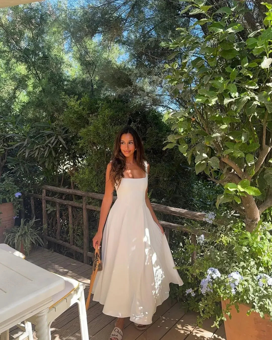 Tyto šaty s lichotivým čtvercovým výstřihem a hlubokým pasem přinášejí moderní nádech klasické elegance. Midi délka nabízí všestrannost, takže se skvěle hodí jak na denní vycházky, tak na večerní akce.