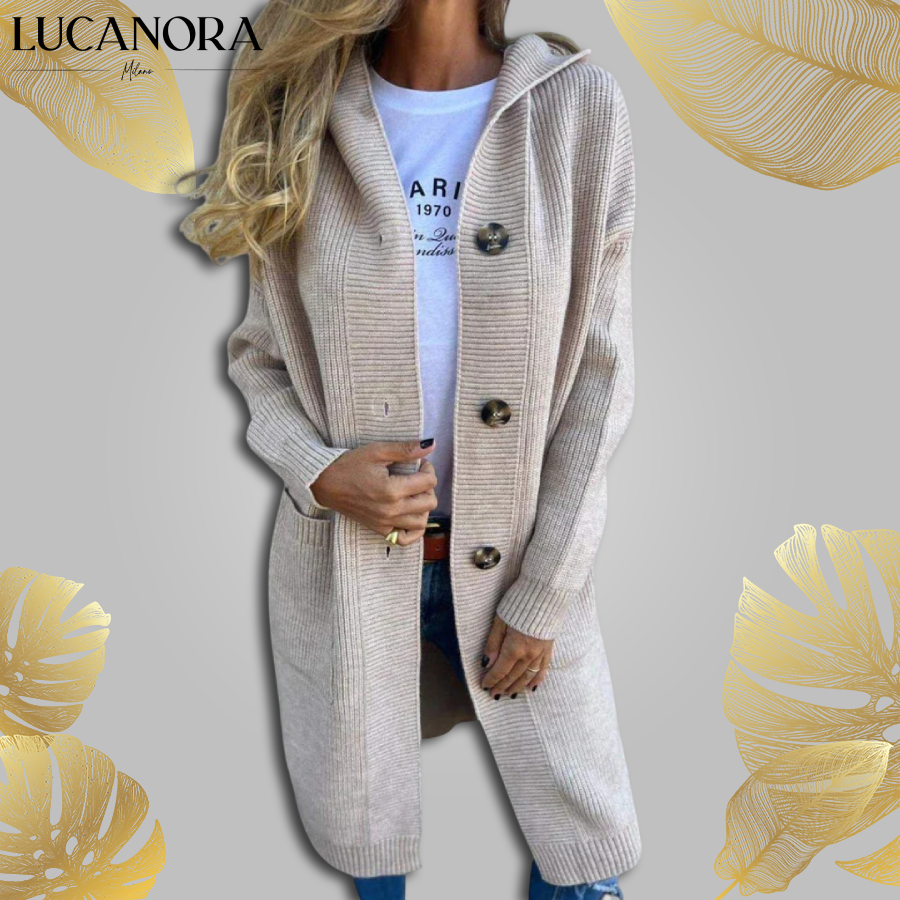 Tento kardigan je vaším novým oblíbeným kouskem, který se snadno obléká a přesto vypadá elegantně. Díky integrované kapuci, pohodlnému zapínání na knoflíky a volnému střihu je to kardigan, který budete nosit, ať už jdete na nákup, pracujete z domova nebo si zajdete na kávu s přáteli. Dlouhý střih vytváří jemnou, lichotivou siluetu a díky zapínání na knoflíky jej můžete nosit rozepnutý pro ležérní vzhled nebo zapnutý, když potřebujete trochu více tepla.