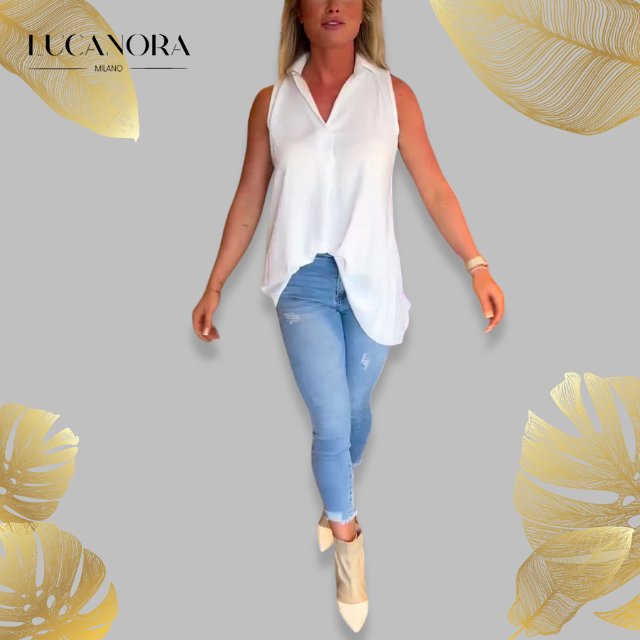 Tento top bez rukávů spojuje rafinovanou jednoduchost s lichotivým střihem. Límec a jemný, plynule tekoucí materiál vytvářejí uvolněný, přesto elegantní vzhled – ideální pro práci, neformální výlety nebo večerní události. Zůstaňte v pohodlí po celý den díky lehkému materiálu a užívejte si top, který zvýrazní každou postavu.