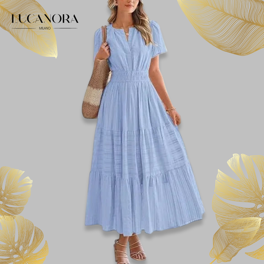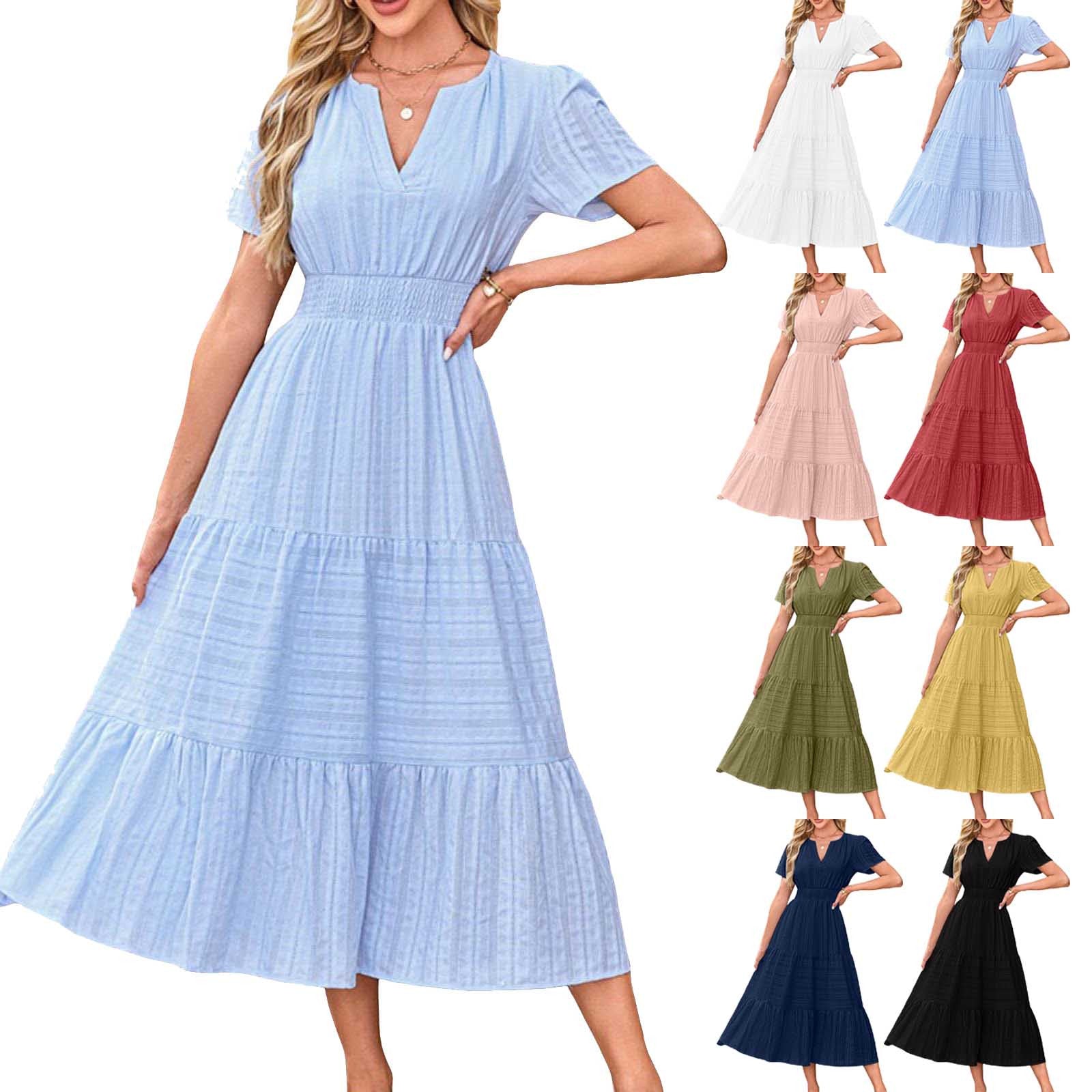 Tyto šaty kombinují lichotivý výstřih do V s jemnými nadýchanými rukávy a vytvářejí moderní, ženský vzhled, který se hodí na vše od pozdního oběda až po večerní rande. Plisovaný design dodává šatům pohyblivost a elegantnost, zatímco měkká tkanina zajistí, že se budete cítit pohodlně po celý den i noc.